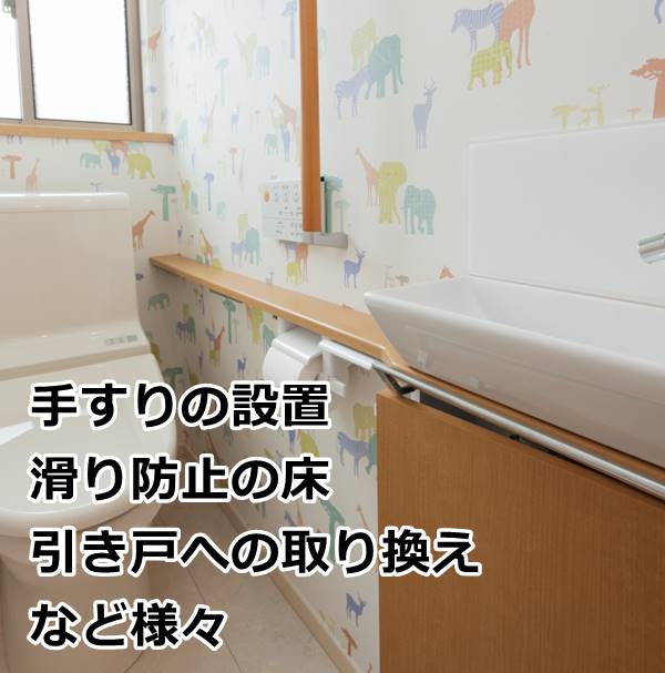 居室における畳から板製床材、フローリング等への変更 浴室やトイレにおける滑りにくい床材への変更 など。