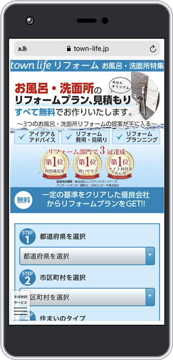 タウンライフリフォームはアンケート調査でリフォーム部門3冠を達成している、実績のあるサイトなんですよ。